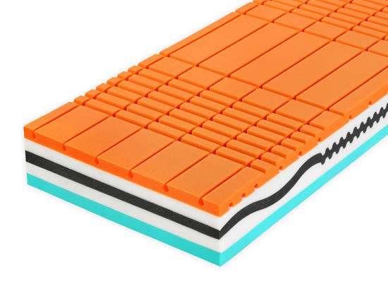 Měkčí strana (oranžová) má 7- zónovou profilaci a provzdušníjícími kanálky, které mění v matraci vzduch s každým pohybem těla (technologie AirForce). Střední část, která napodobuje naši páteř je složena z pěn Flexi o různých tuhostech. Potah Tencel® s přírodními vlákny je pratelný na 60 °C, dvojdílný.