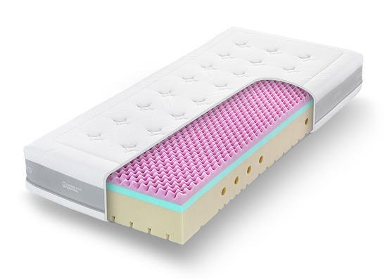 Hybridní gelová pěna GelTouch (strana soft ). Speciální pěna, která snoubí hebkost latexu s dokonalou distribucí tlaku gelových matrací. Vysoce prodyšná, napomáhá správné termoregulaci.